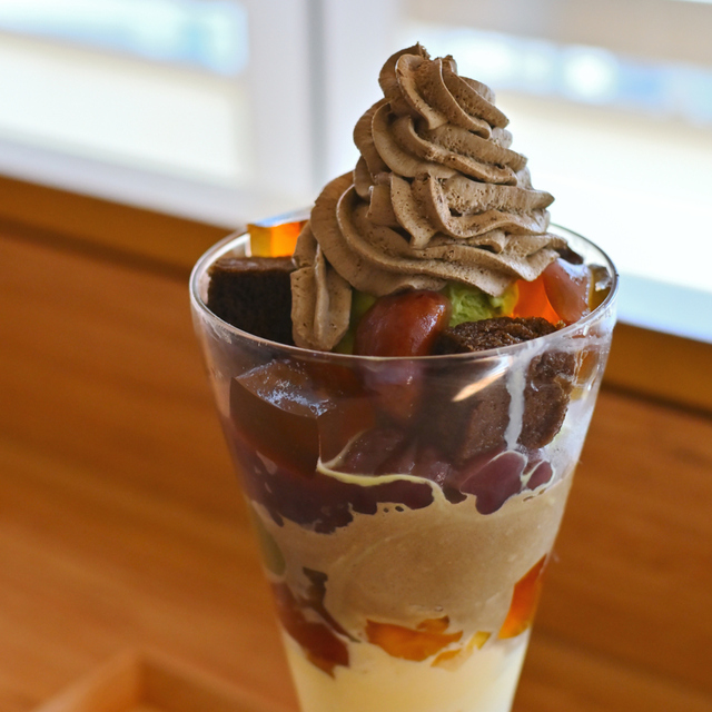 紫と青の錦玉羊羹ゼリー・抹茶ゼリー・抹茶アイス・抹茶クッキー・塩アイス・あずき・煎茶ゼリーでできています。