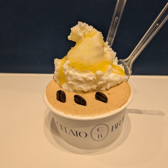 焦がしてコク深いキャラメル味のジェラートにフランス産のゲランドソルトをトッピングしてあります。