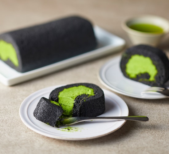 お茶の鑑定士が厳選した抹茶を惜しみなく使ったクリームを竹炭を練り込んだスポンジで巻いたロールケーキです。