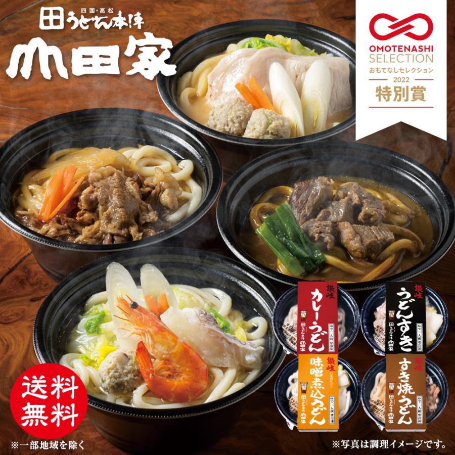 うどんすき・カレーうどん・すき焼きうどん・味噌煮込みうどんの4種類です。