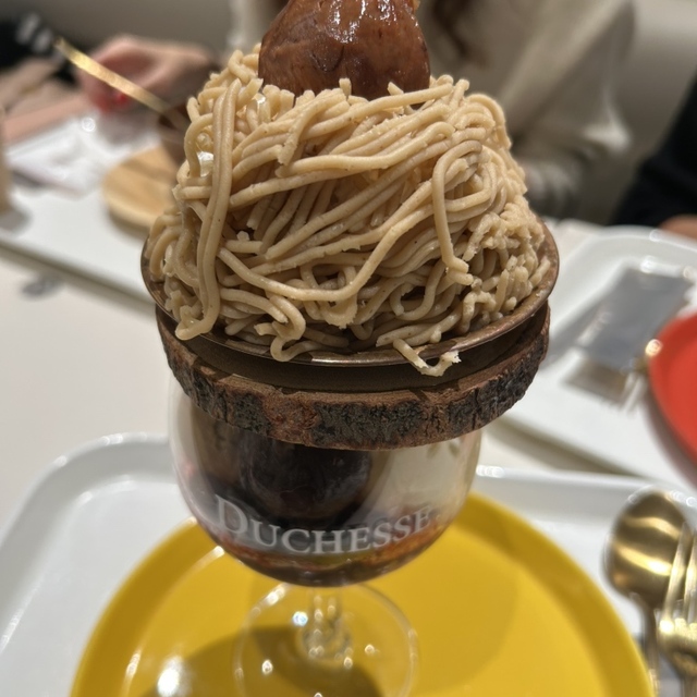 杏仁ミルクと杏子シロップかけた上にサクサクな自家製パイがトッピングしキャラメルソースが仕上げにかけています。