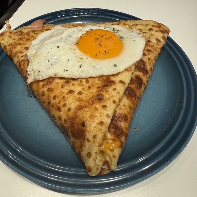しっとりもちもちの生地の上で卵をのばしその上にクリームチーズ・マッシュルーム・ミックスチーズ・バターソテーオニオン・サーモンがたっぷり入ったクレープです。